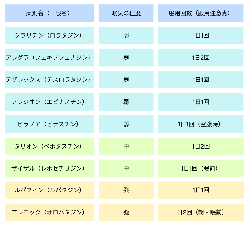 仕事や勉強などで眠気の出現をなるべく避けたい方には、表の上部の薬がお勧めです。