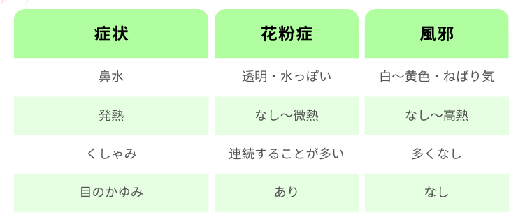 花粉症とかぜとでは、主に鼻水の性状が異なります。花粉症の場合は透明でサラサラとした鼻水が特徴的で、連続したくしゃみを伴うことも多いです。一方、かぜの場合はねばり気のある黄色っぽい鼻水が特徴的です。また、花粉症では鼻水の他に目のかゆみや目の充血も伴うことが多いですが、かぜではこれらの症状は基本的に伴いません。